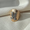 This great vintage find has fab finger coverage and a diamond set N against a florentine textured backdrop. Love the scale of this ring! It is sizable, and may fit snug due to width.