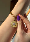 The charm itself is three colors of gold- yellow, rose, and an inner star-shaped diamond center. It's completely reversible, for sparkle on both sides! The floral clasp is the sweetest detail and oh so special.