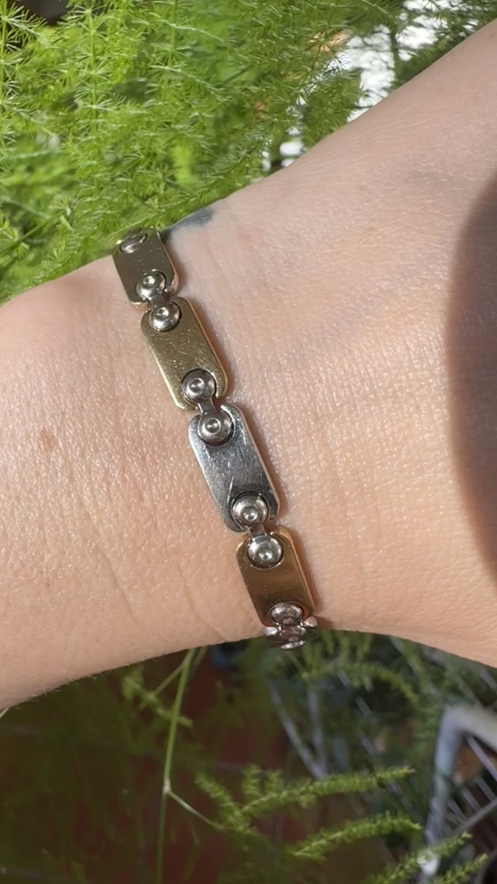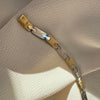 This stunning 18k bi-color tab link bracelet is the perfect blend of sophisticated and wearable. Each geometric tab link catches the light beautifully, creating an eye-catching pattern on the wrist. The secure link construction ensures durability for everyday wear, while the mixed metal finish adds versatility to your jewelry collection.