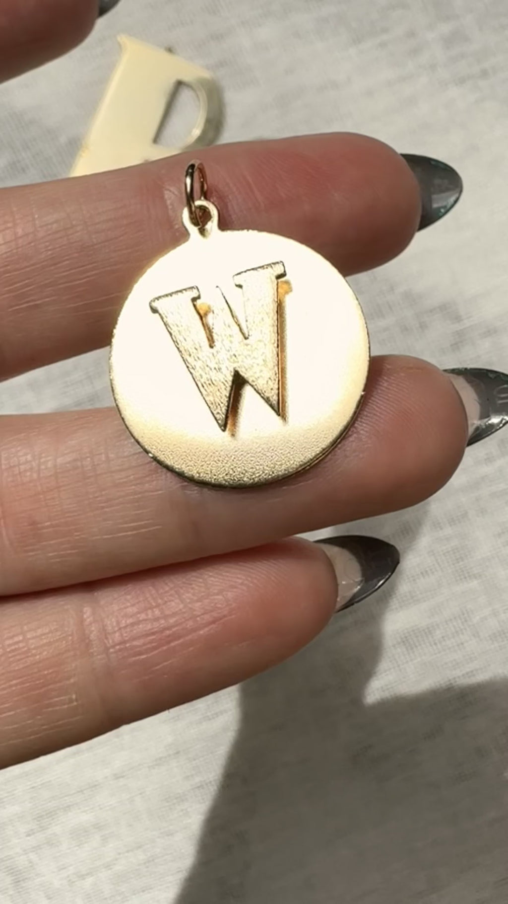 Solid 14k gold disc measuring just under 1" wide with a raised W, detailed with a beautiful texture. The disc is smooth with a soft matte finish. Great size and weight!