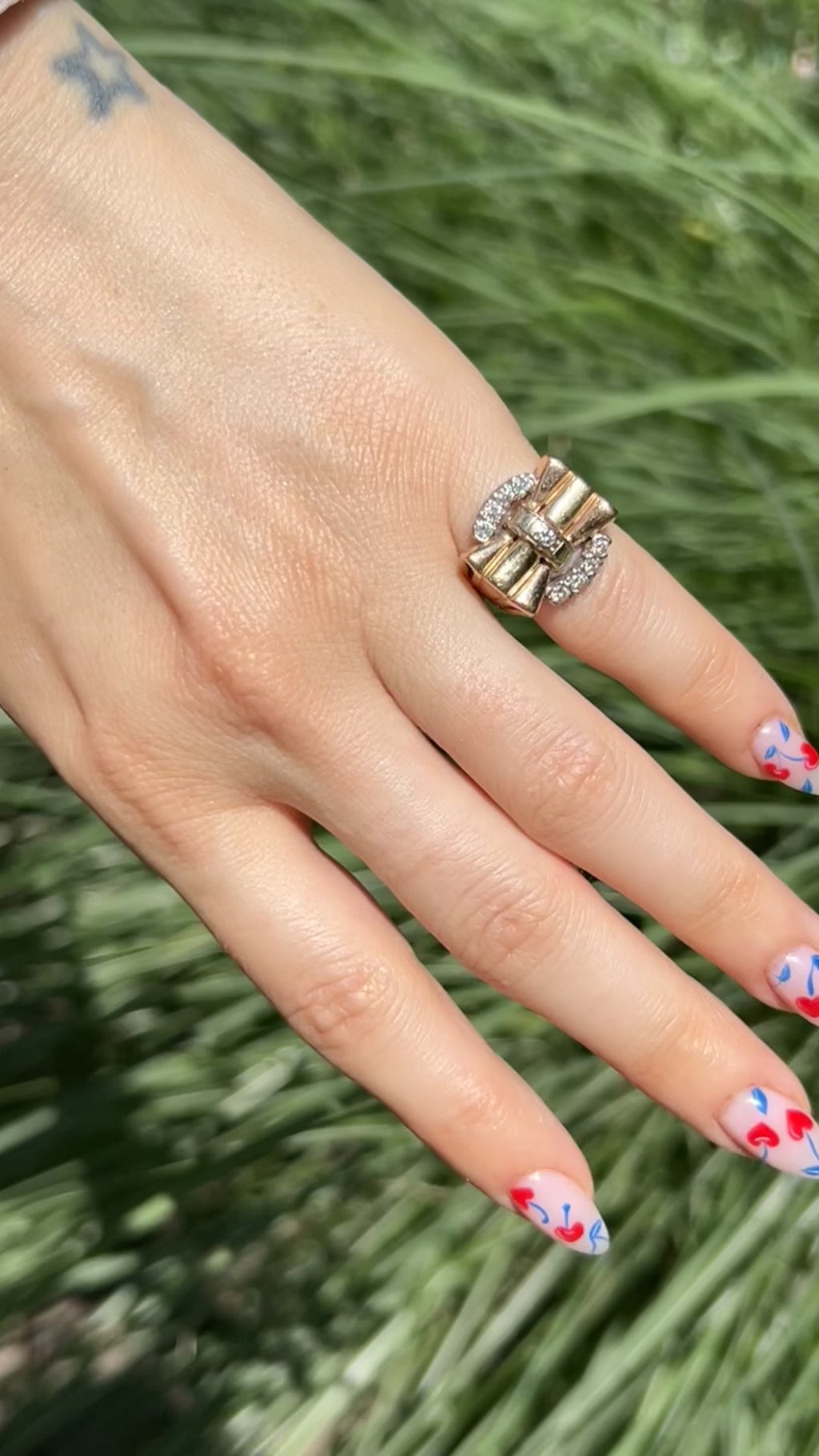 It's no secret I love a good retro ring- this one is certainly an easy fave since it is the sweetest bow shape! Crafted mainly in yellow gold, it has rose gold accents with the diamonds set in white gold for maximum impact. Such a sweet 1940s find!