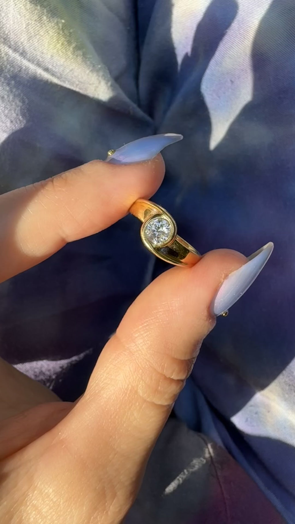 Simplicity at its best- a solitaire ring crafted in rich 18k gold with a sparkling .40 carat diamond. It has a lovely look on the hand, and currently at a size 3.5 would make an excellent pinky ring option. However, I can size the ring to nearly any size with my jeweler- please send a note if you'd like to discuss sizing.